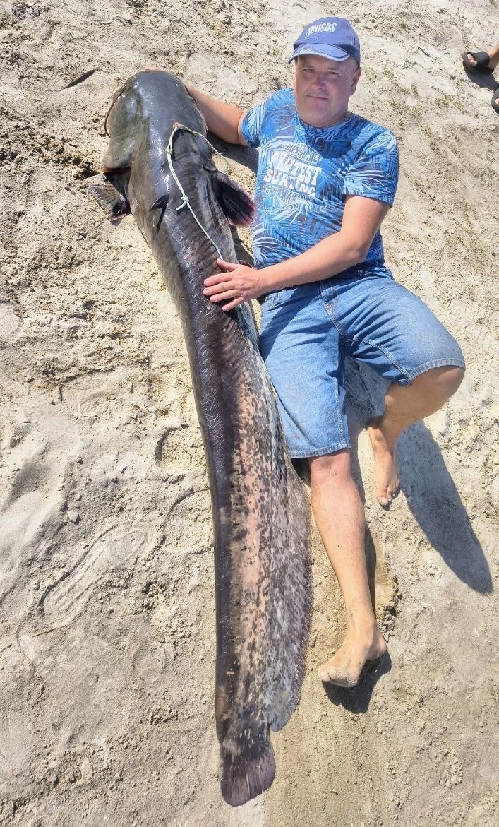 Рыбак Антон Куренков показал в социальных сетях удачный улов — огромный сом весом почти 50 кг. На рыбалку его пригласил давний знакомый из села Кулешовка в Азовском районе.