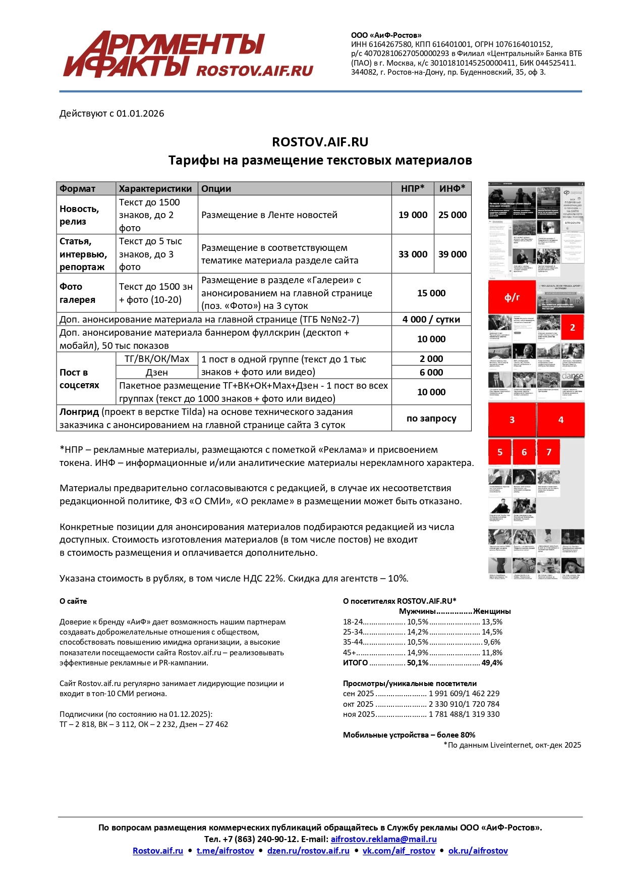 Сайт Rostov.aif.ru регулярно занимает лидирующие позиции и входит в топ-10 СМИ региона. Высокие показатели посещаемости сайта Rostov.aif.ru и наших соцсетей позволяют реализовывать эффективные рекламные и PR-кампании.